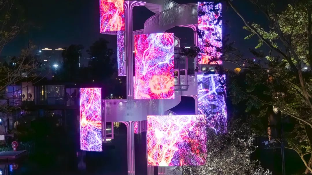 利亞德LED異形顯示屏的應(yīng)用,助力打破傳統(tǒng)美術(shù)館單一功能與形態(tài)。利亞德LED異形顯示屏不僅實現(xiàn)了與生命塔建筑外觀的無縫融合,還通過顯示屏的動態(tài)旋轉(zhuǎn)功能,增強(qiáng)了展示的互動性和動態(tài)美,讓建筑外觀得以自我更新和擴(kuò)張,實現(xiàn)靈活和自由的空間布局,成為具有生命力的載體;
